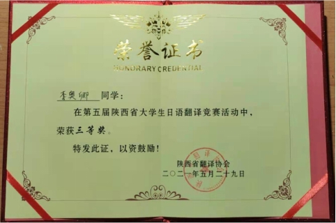 2021年5月29日,第五届陕西省大学生日语翻译竞赛决赛暨颁奖典礼在西安文理学院雁塔校区565net必赢客户端举行,来自全省高校的30余名学生相聚于此,参与角逐。必赢官网日语专业3名本科生参与了此次比赛,且都取得了优异成绩。2018级李奥卿获三等奖,2018级张家桐、2019级闫雅琪获优秀奖,日语系教师翁建文获优秀指导教师奖。