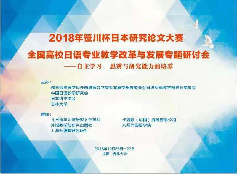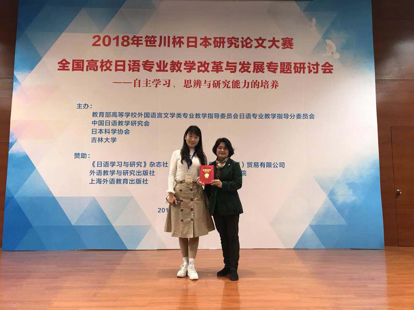 2018年10月27日,在吉林大学举行的全国首届笹川杯大学生日本研究论文大赛中,由我校565net必赢客户端薛红玲老师指导的日语系2015级许凯欣同学获得文化组三等奖。