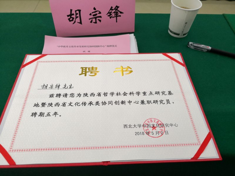 胡宗锋教授受聘为陕西省哲学社会科学重点研究基地暨陕西省文化传承类协同创新中心兼职研究员聘书