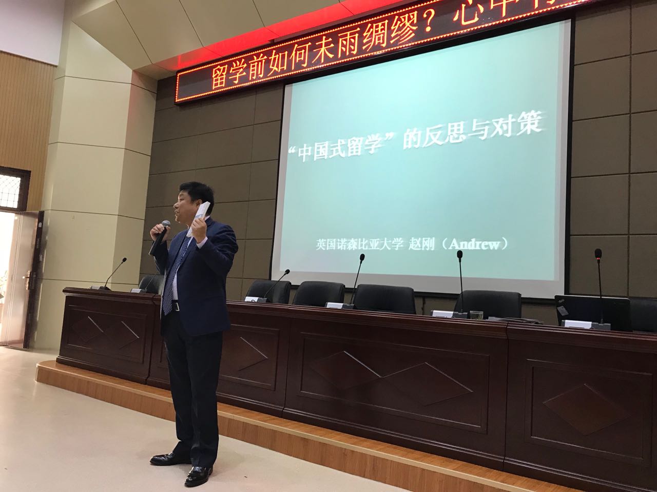 2017年11月8日下午,国际教育知名专家,英国诺森比亚大学中国区首席代表赵刚在外语第二课堂为师生做了题为“中国式留学”的反思与对策讲座。565net必赢客户端教学副院长曹若男出席并介绍了嘉宾。讲座中,赵刚老师用生动案例幽默风趣地向大家讲述了中国式留学存在的问题并鼓励在校大学生养成主动阅读、批判性思维的良好习惯以适应未来的留学生活。