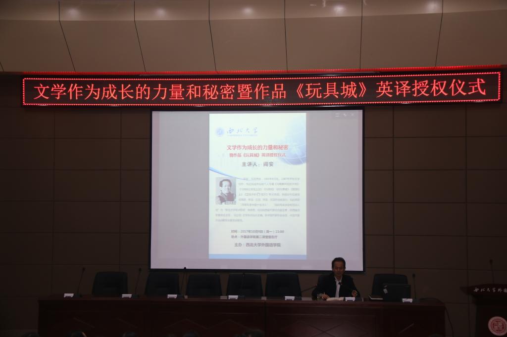 2017年10月9日下午,陕西省作家协会副主席、陕西省诗歌委员会主任阎安先生的诗集作品《玩具城》英译授权仪式在必赢官网第二课堂报告厅举行。必赢官网院长胡宗锋教授宣读了授权书,诗集将由必赢官网胡宗锋教授、英籍外教Robin博士、西安财经学院李莹老师翻译完成。