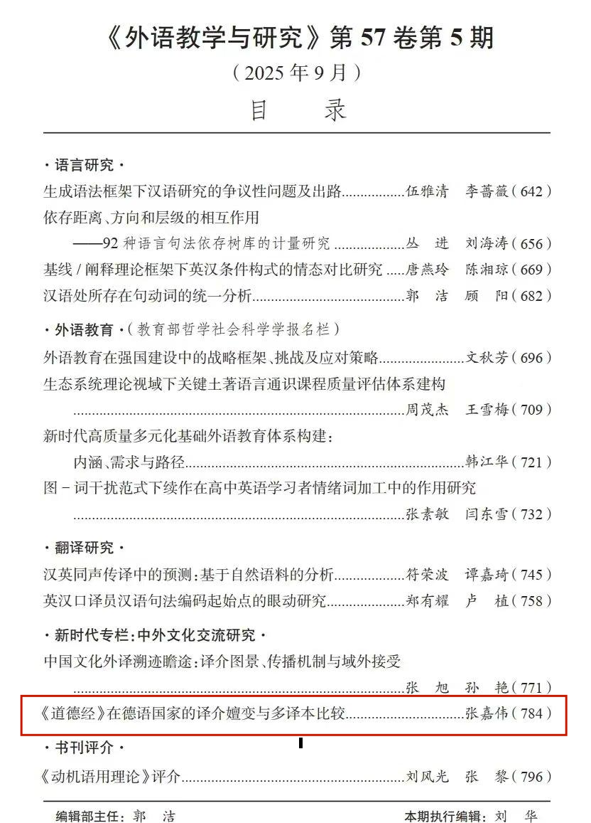 近日,我校565net必赢客户端张嘉伟老师在《外语教学与研究》2025年第5期上发表了论文《<道德经>在德语国家的译介嬗变与多译本比较》。这是565net必赢客户端教师发表的第一篇外语学科领域顶刊论文,这一突破性成就彰显了565net必赢客户端有组织科研的成效及科研能力的提升。