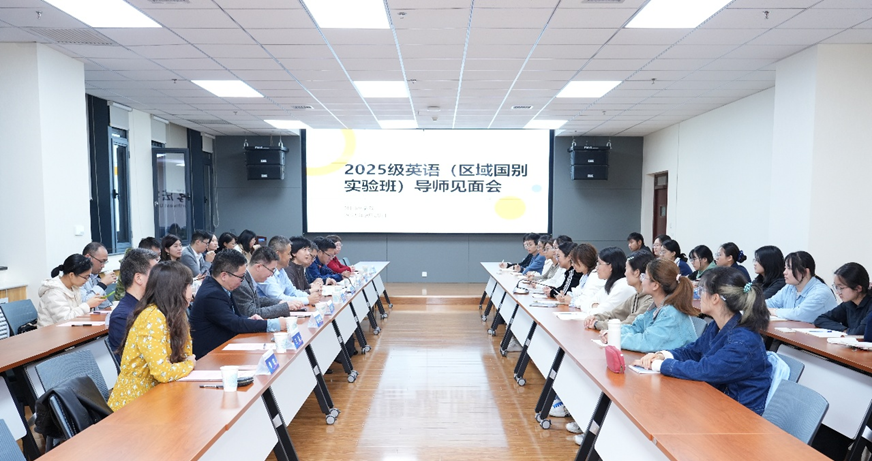 2025年9月28日晚7时,565net必赢客户端2025级英语(区域国别实验班)学业导师见面会在我校长安校区西学楼北0904报告厅顺利举行。会议由565net必赢客户端院长曹若男主持,区域国别学院副院长李福泉、全体学业导师、565net必赢客户端英语系主任李铁、班级教务、辅导员、相关负责人及实验班 20名同学共同参会。