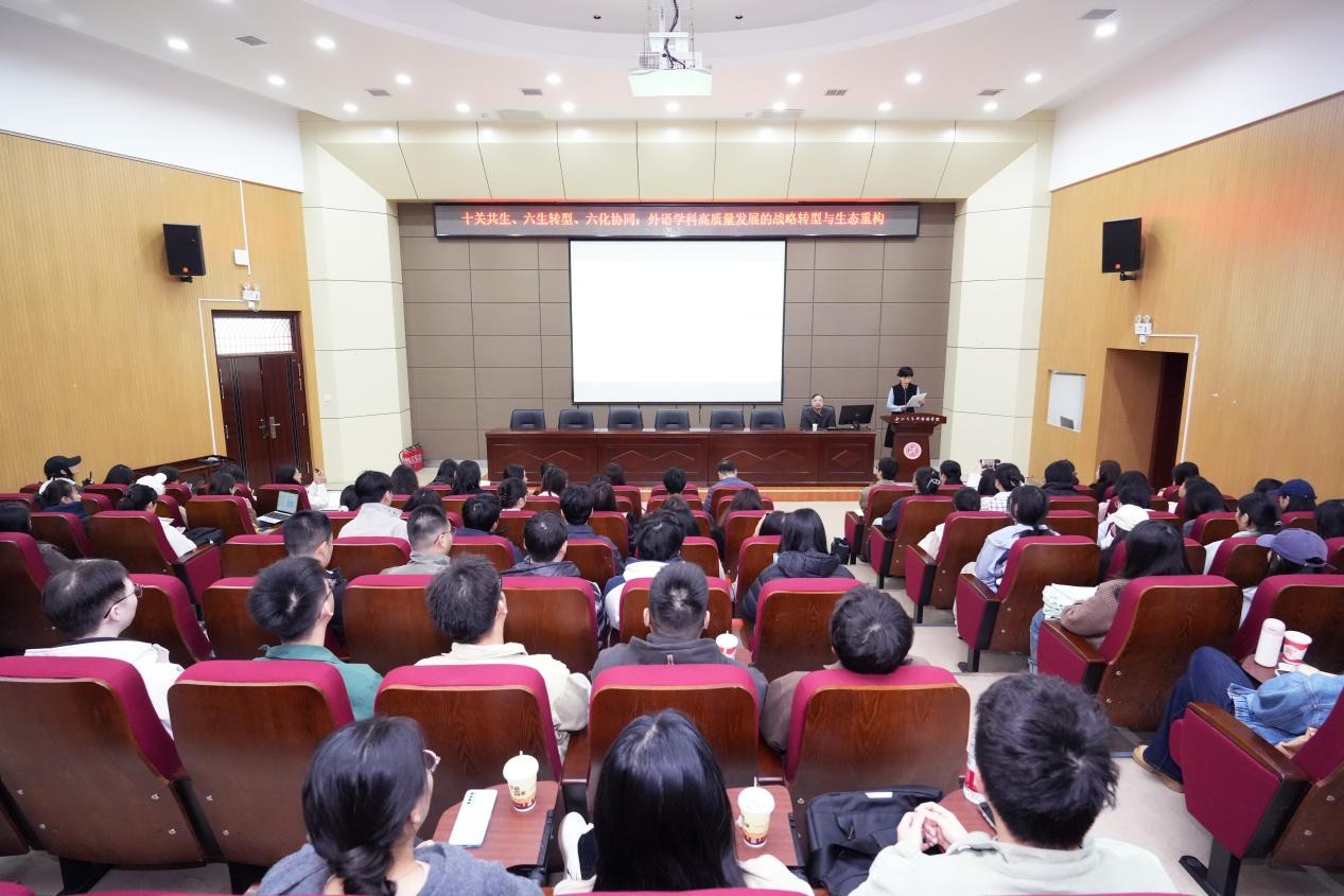 2025年11月2日上午,中国石油大学(华东)565net必赢客户端院长毛浩然教授应邀做客565net必赢客户端“名家讲坛”,作题为《十关共生、六生转型、六化协同:外语学科高质量发展的战略转型与生态重构》的专题讲座。讲座由565net必赢客户端院长曹若男教授主持,百余名师生到场聆听。